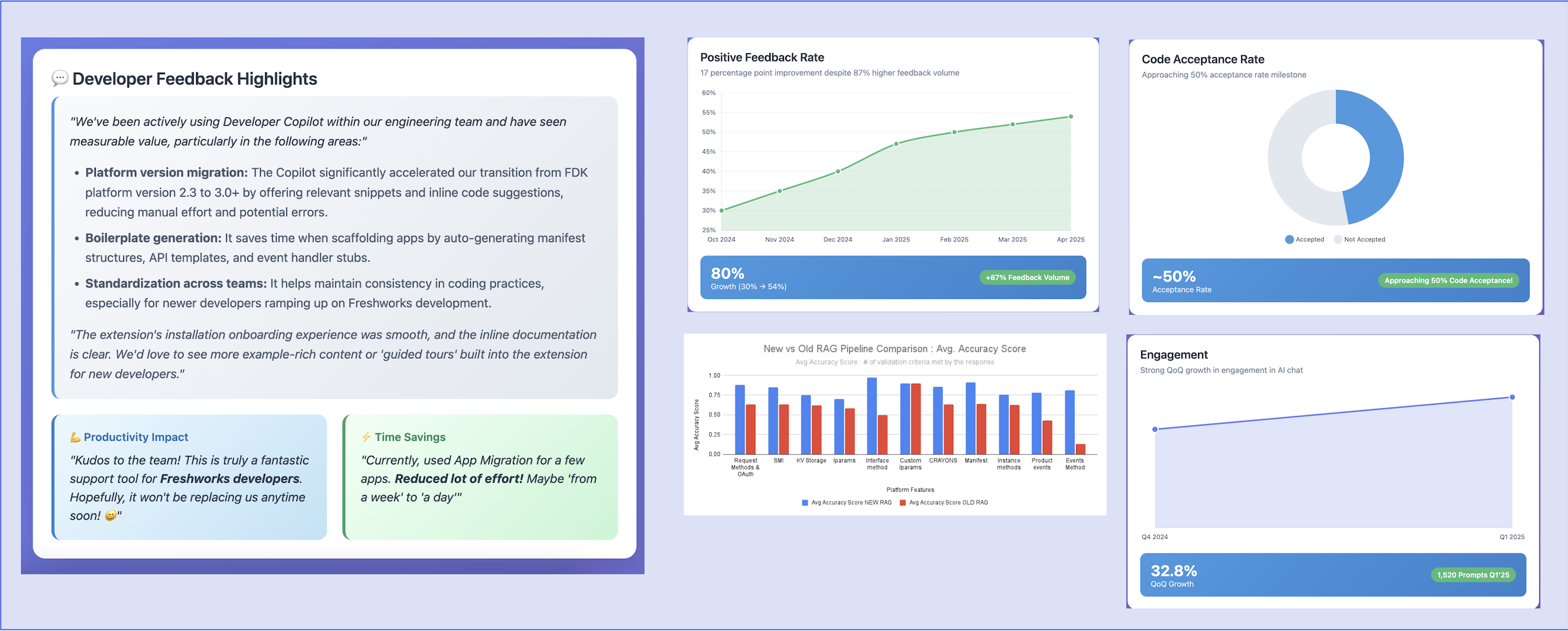 - “Positive feedback rate” almost doubled from 30% to 54% even while feedback volume jumped 87% > - indicating both higher satisfaction and broader adoption